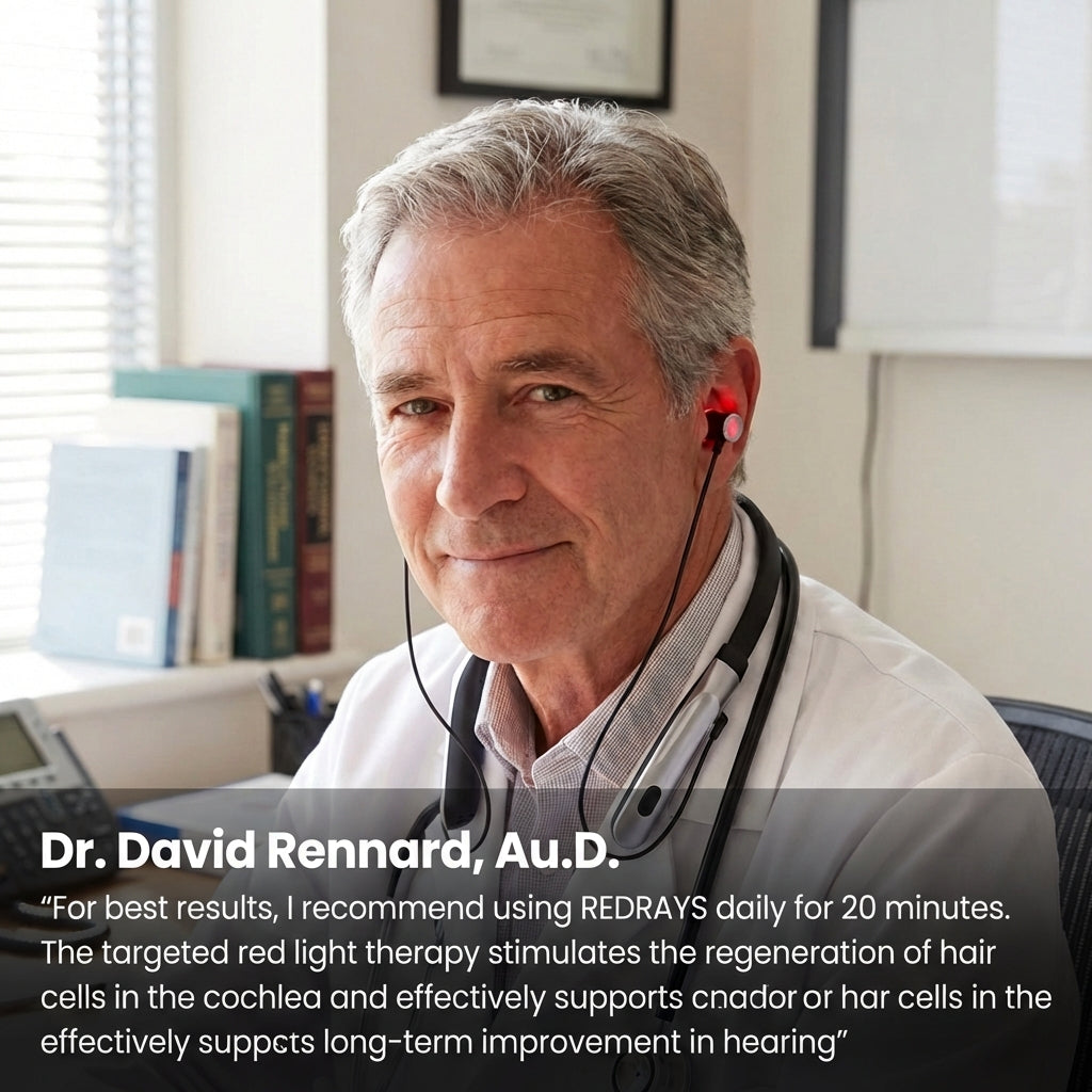 Hearing loss starts when the tiny hair cells in your inner ear stop getting the blood flow and nutrients they need to function. REDRAYS changes that. Our targeted red light wavelengths penetrate deep into the ear canal, stimulating circulation and awakening damaged cells at the source. The result? Reduced tinnitus, clearer sound, and a brain that no longer has to fight to fill in what's missing.